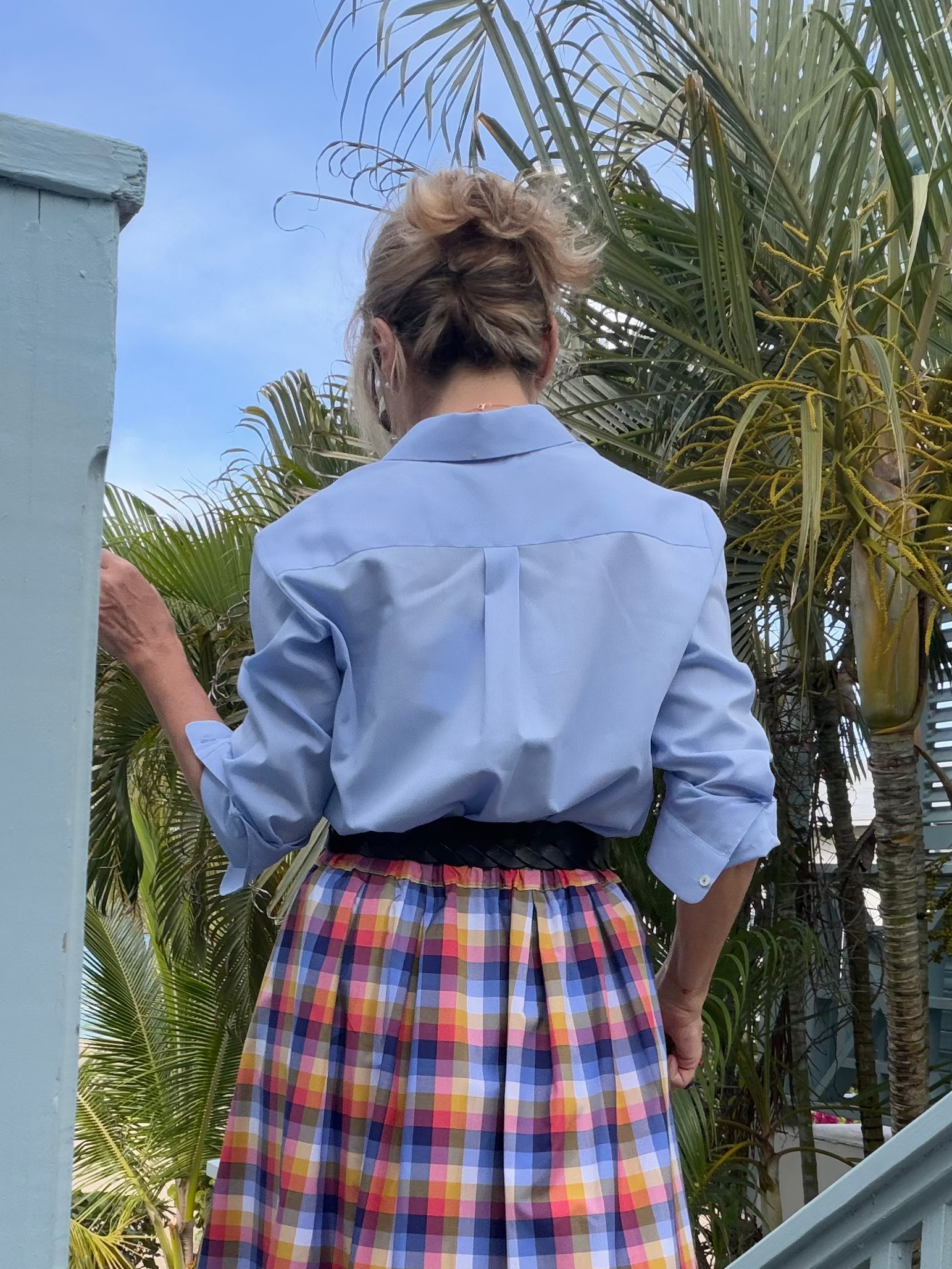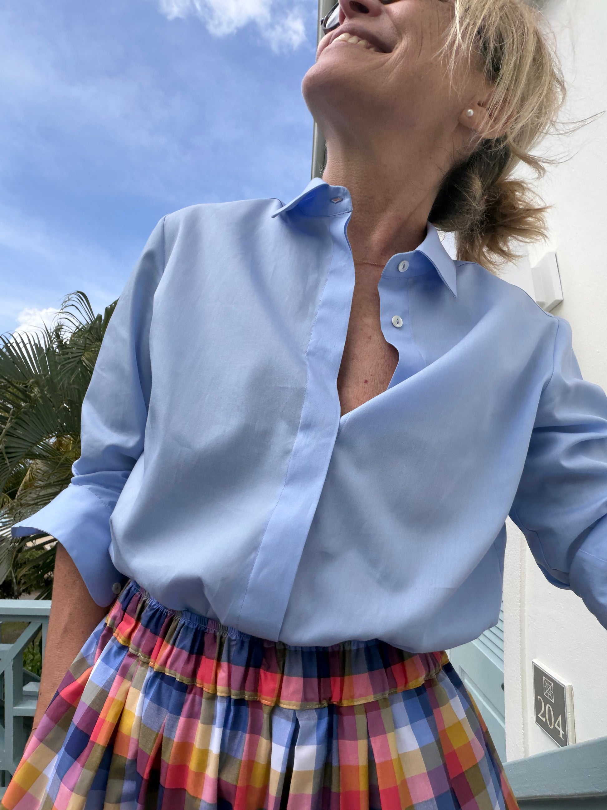 Camicia di popeline di cotone, colore azzurro, taglio dritto con bottoni in madreperla nascosti.