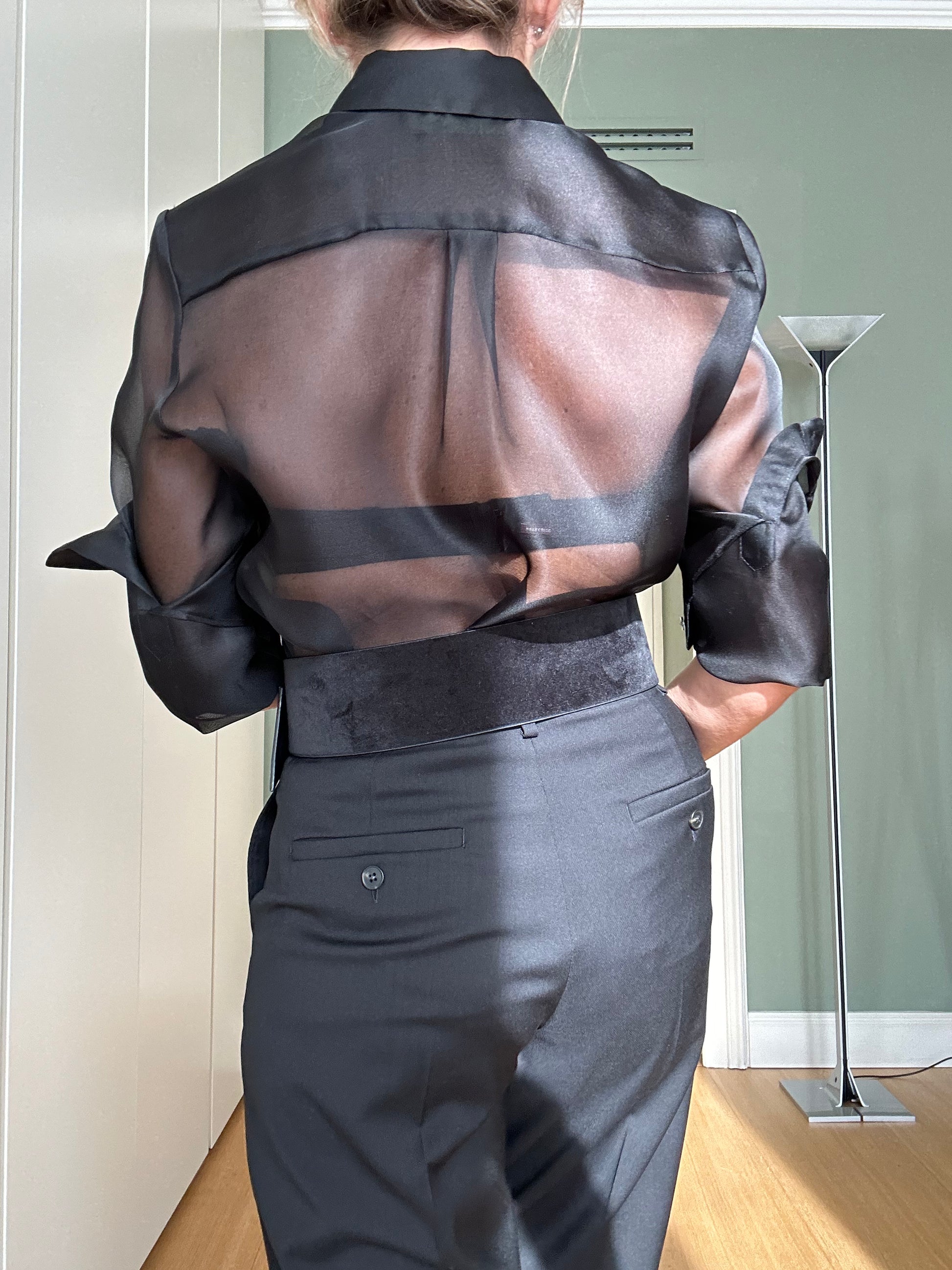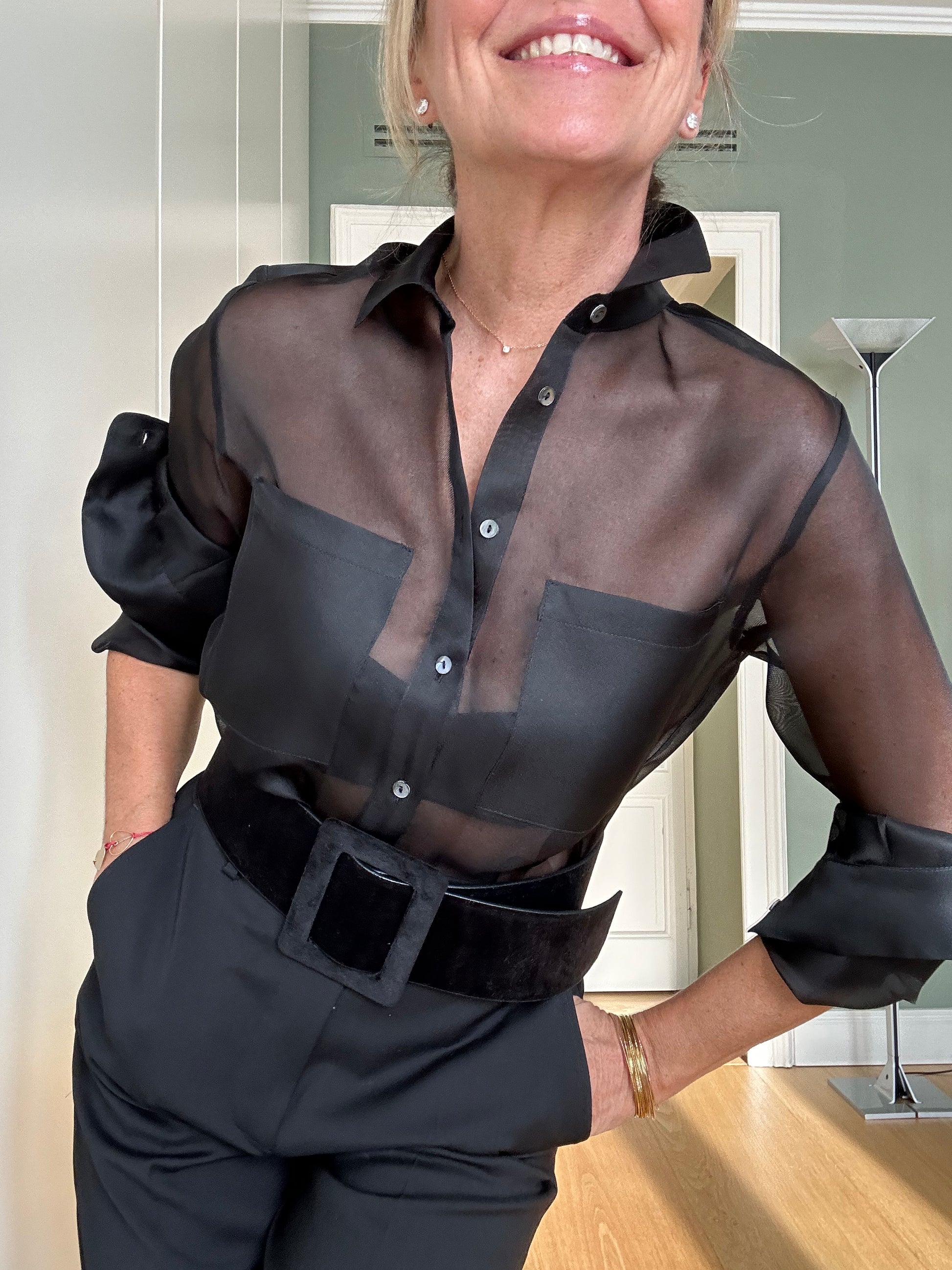 Silk organza shirt, black, straight cut with patch pockets and visible mother-of-pearl buttons.