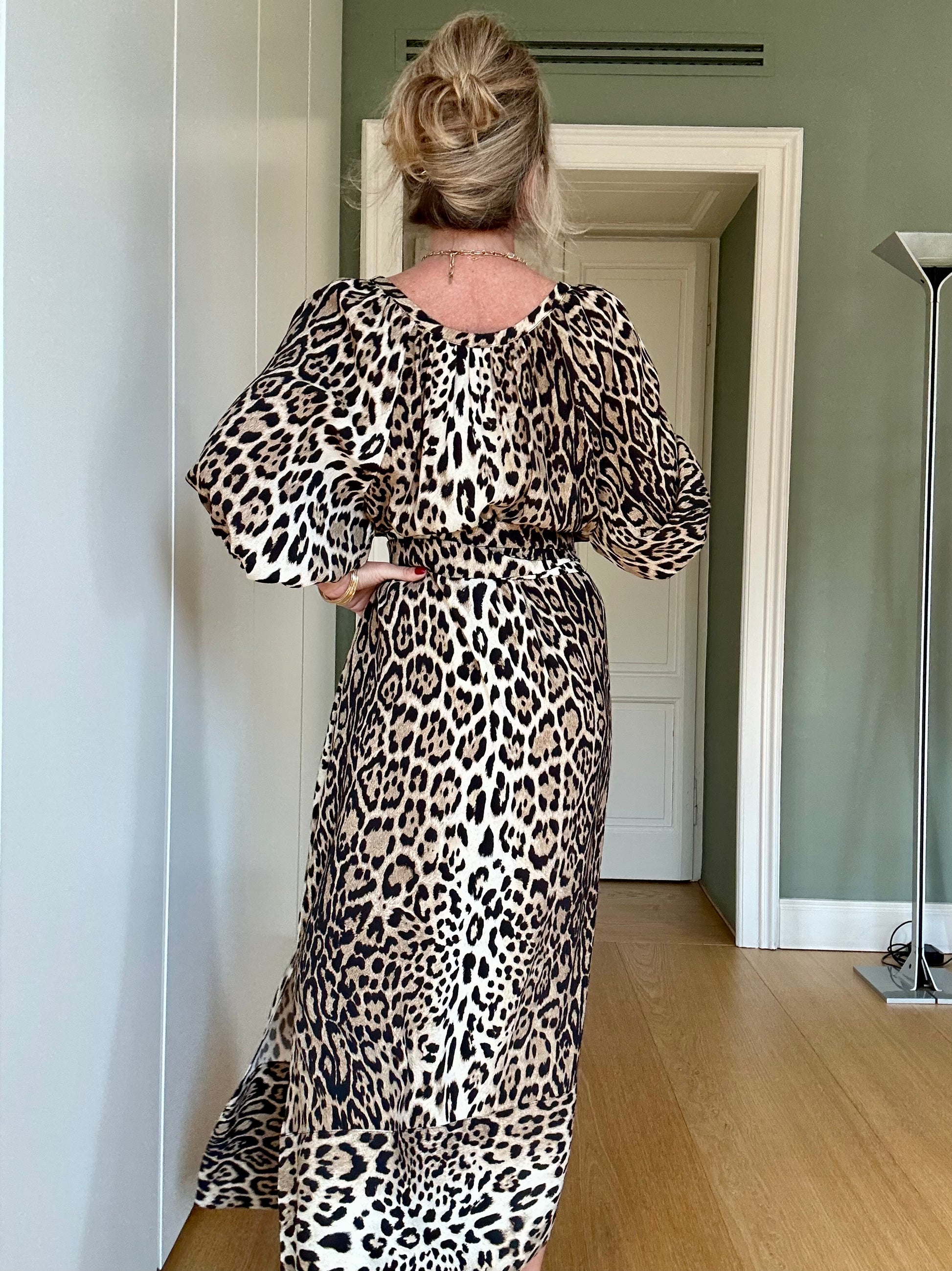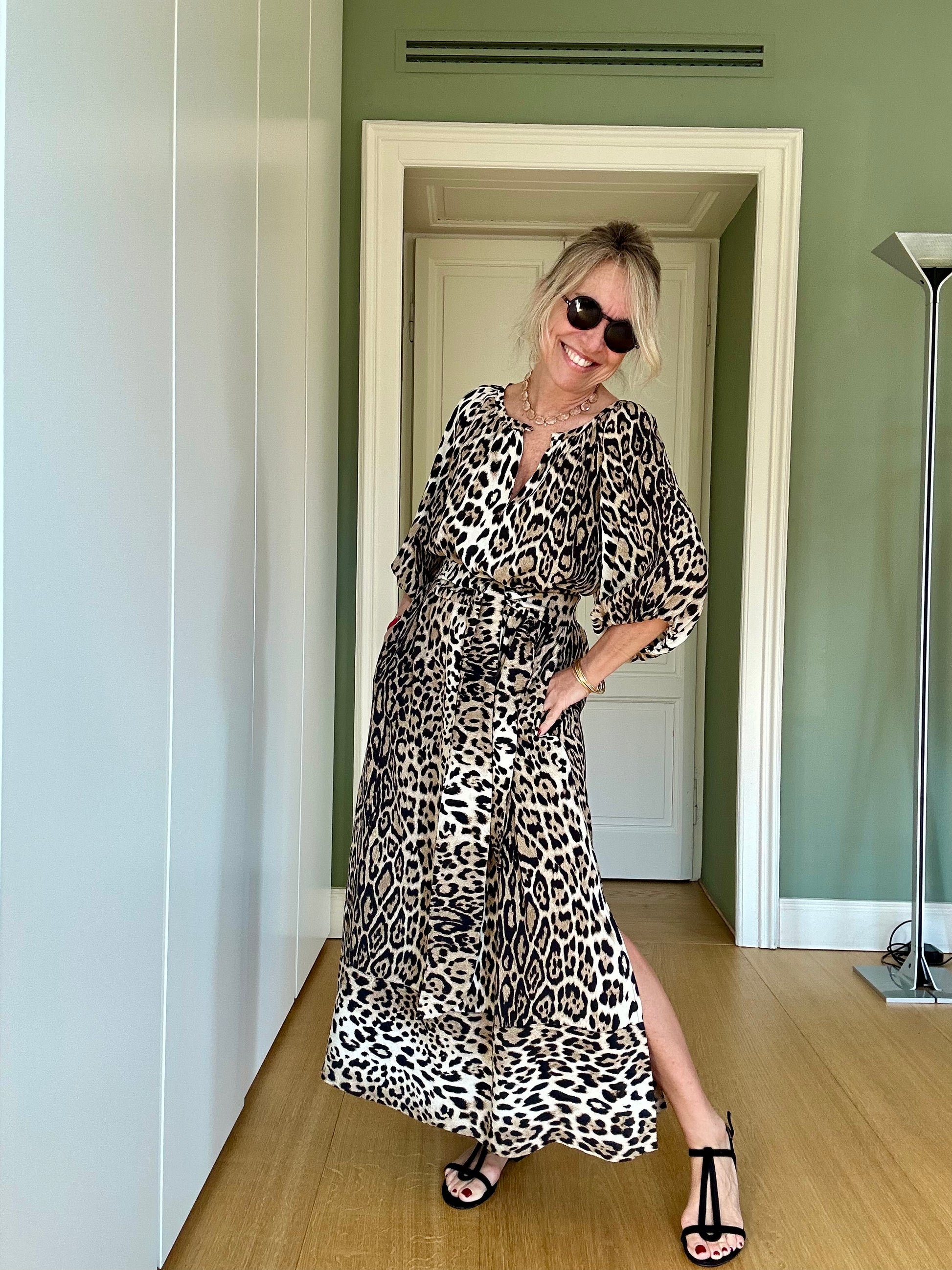 L’abito Armand può essere indossato da entrambi i lati (scollo rotondo o a V), è tagliato a trapezio, con tasche, spacchi laterali e fusciacca da annodare in vita.