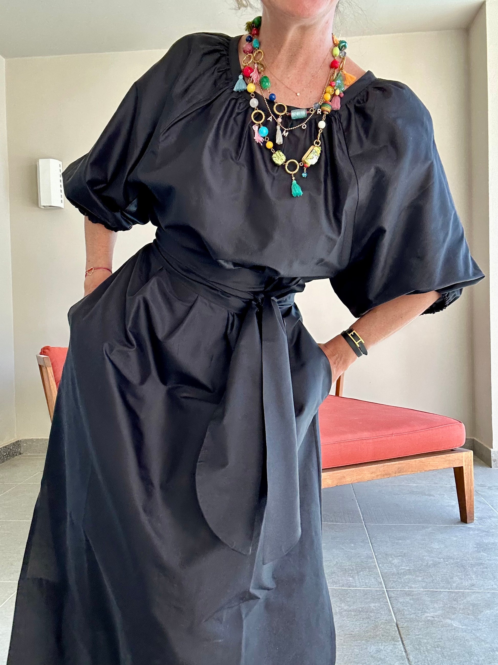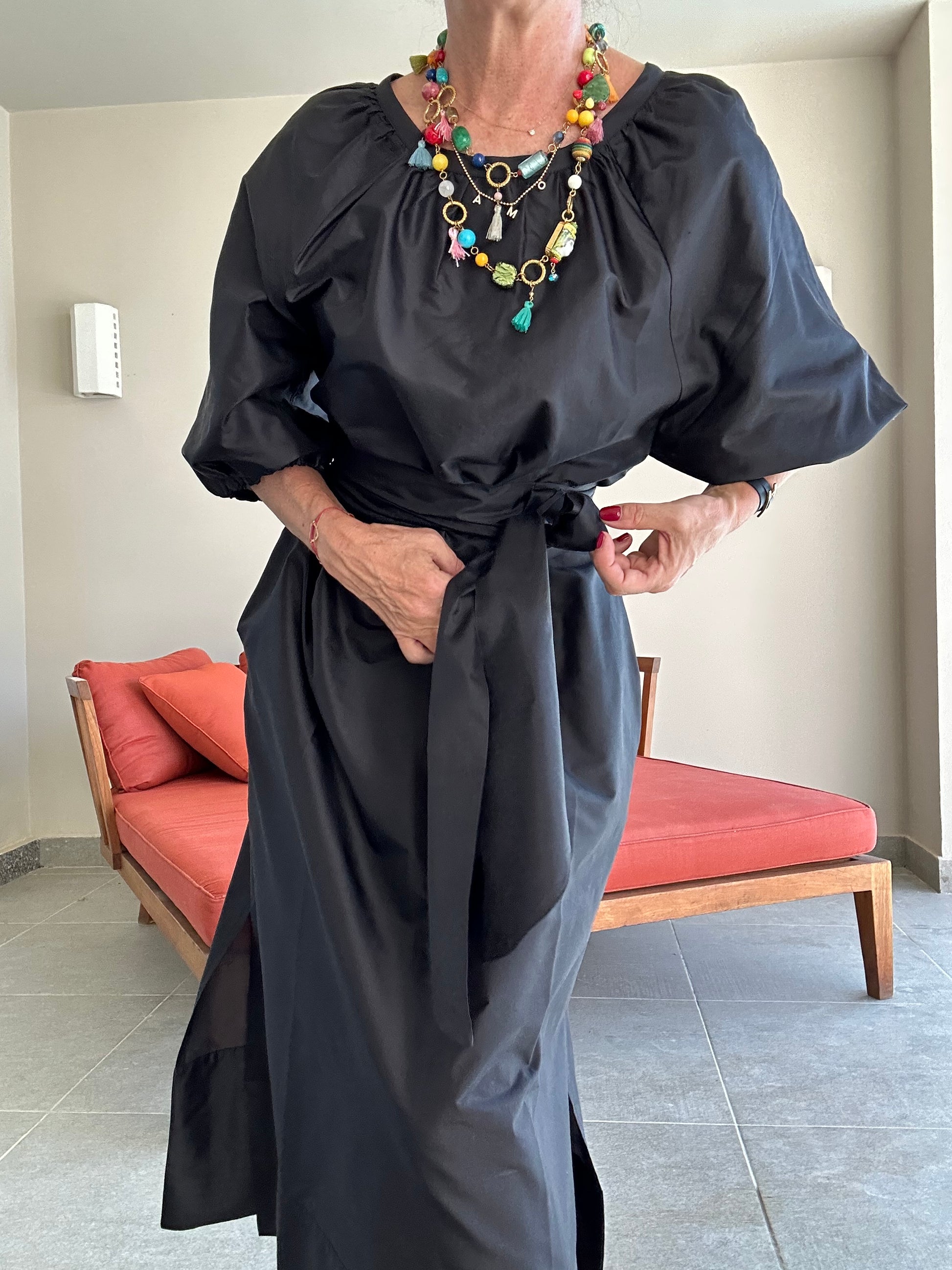 L’abito Armand può essere indossato da entrambi i lati (scollo rotondo o a V), è tagliato a trapezio, con tasche, spacchi laterali e fusciacca da annodare in vita. Colore nero.