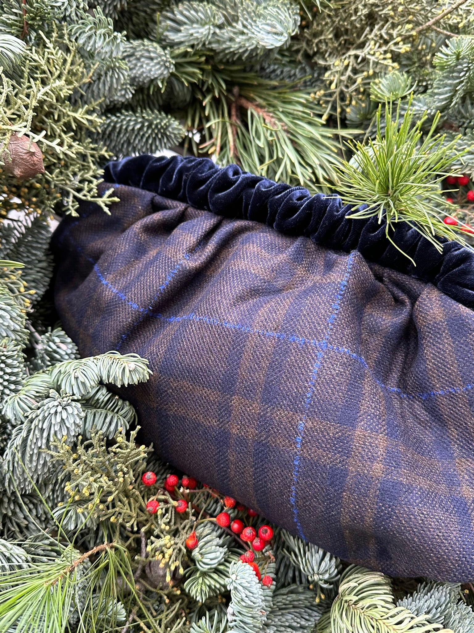 Deliziosa clutch in pura lana vergine, con manico a contrasto in velluto e rivestimento interno in seta. Taschino interno. No tracolla.