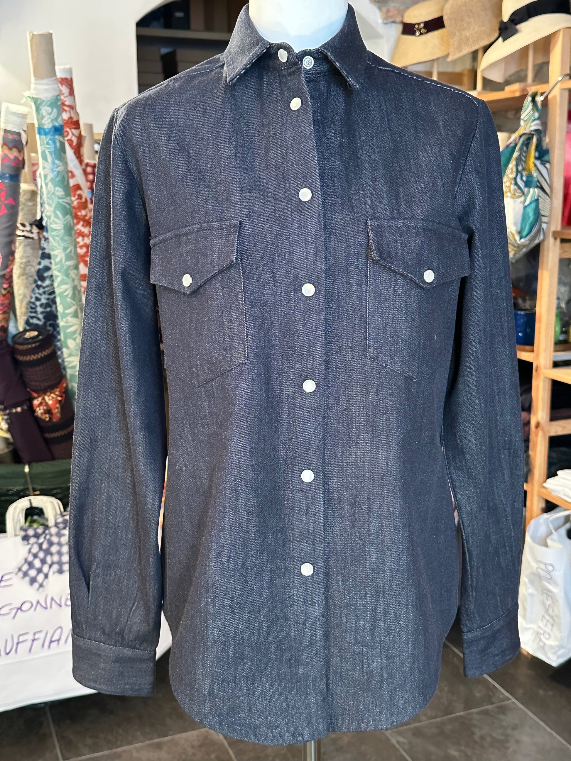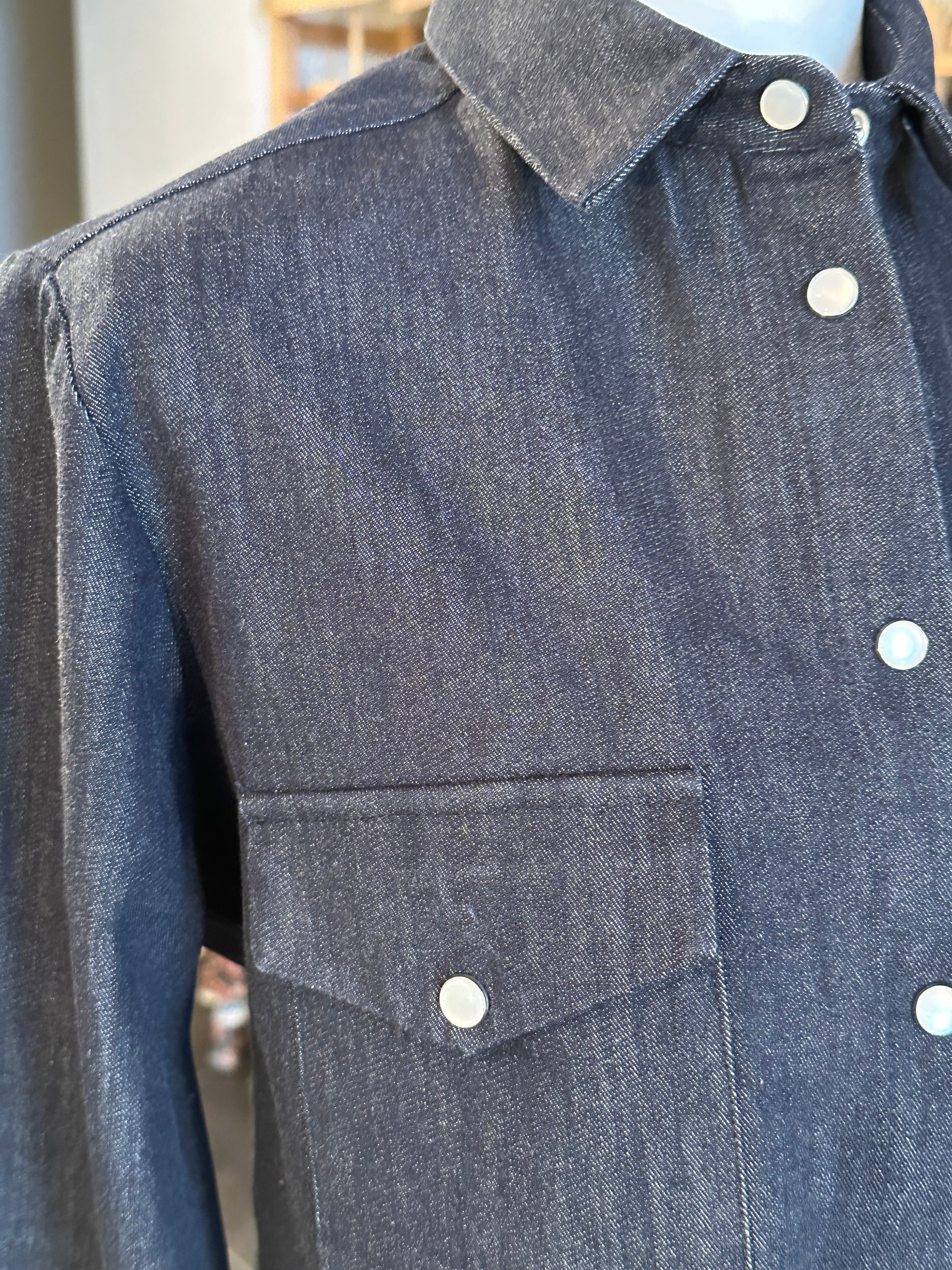 Camicia denim pesante, colore blu scuro, taglio dritto con bottoni a pressione in madreperla e tasche applicate.