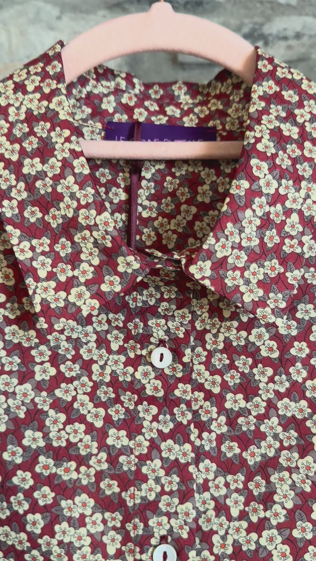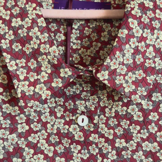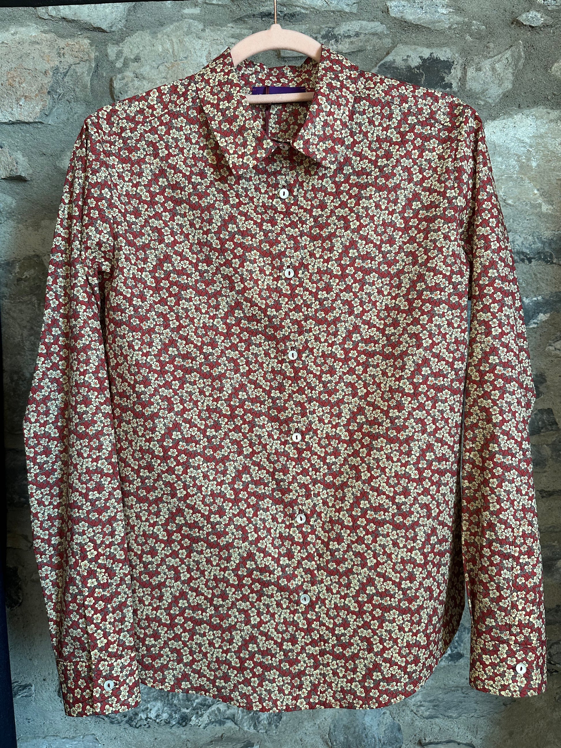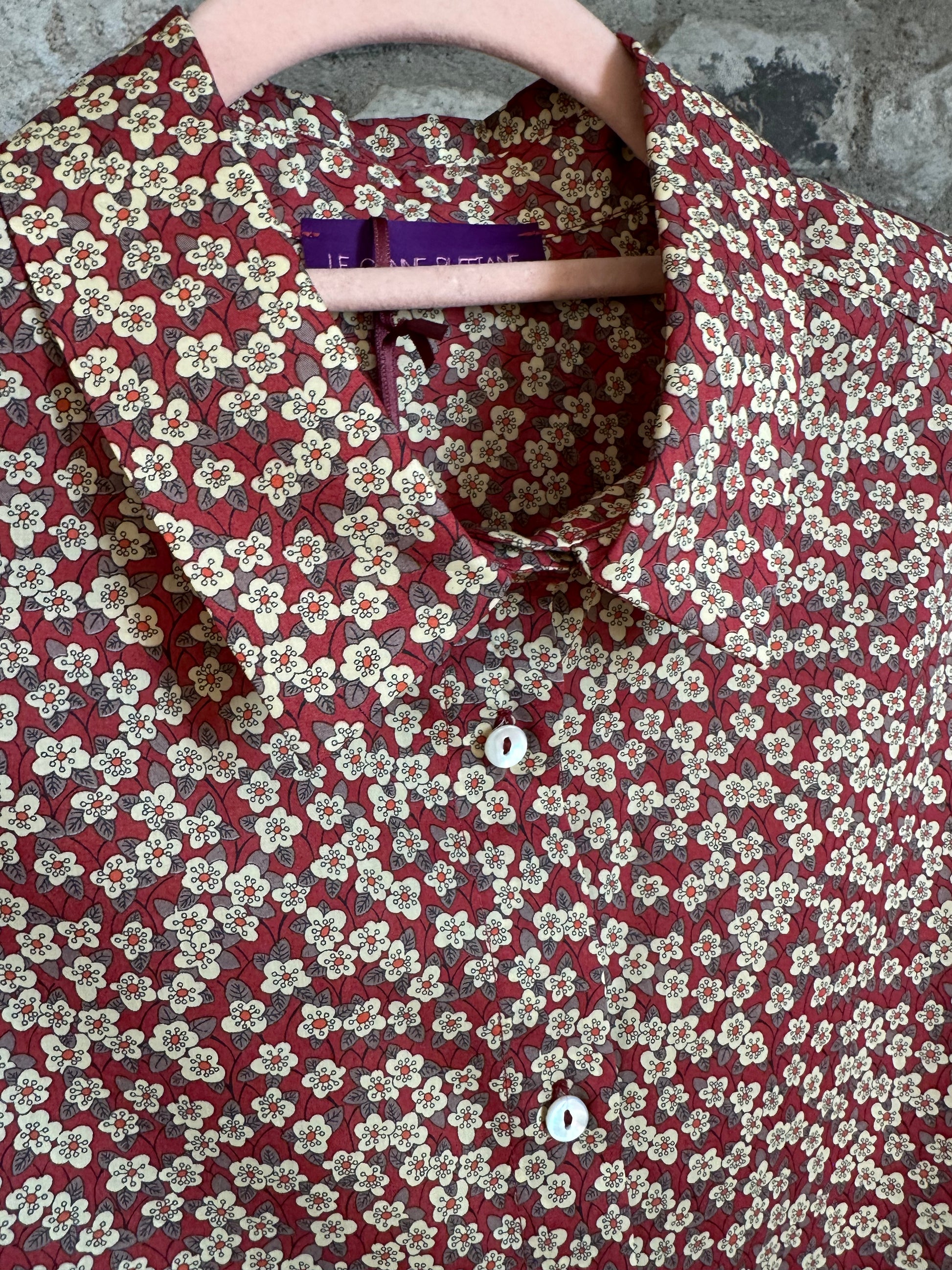 Camicia di cotone Liberty a fiorellini, colore mattone/bianco, taglio dritto con bottoni in madreperla nascosti.