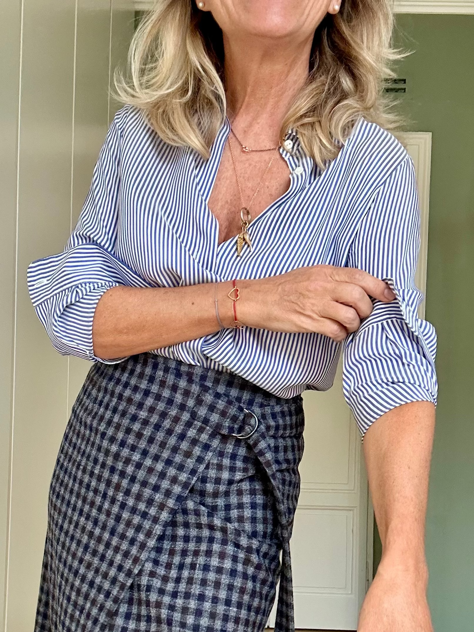 Camicia di seta a righe bianche e blu, taglio dritto con bottoni in madreperla nascosti.