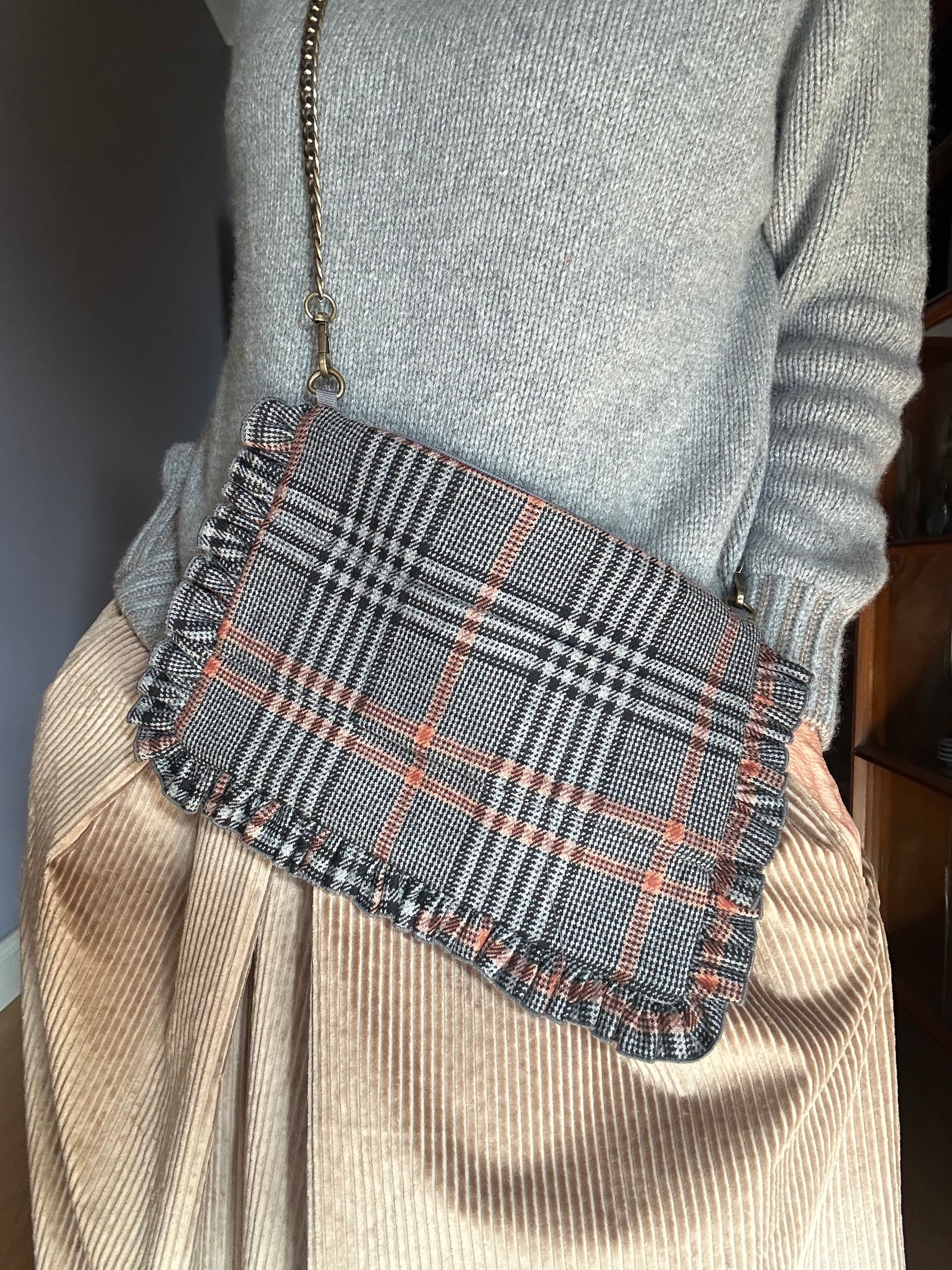 Deliziosa pochette in lana con ruches, foderata in twill di seta.