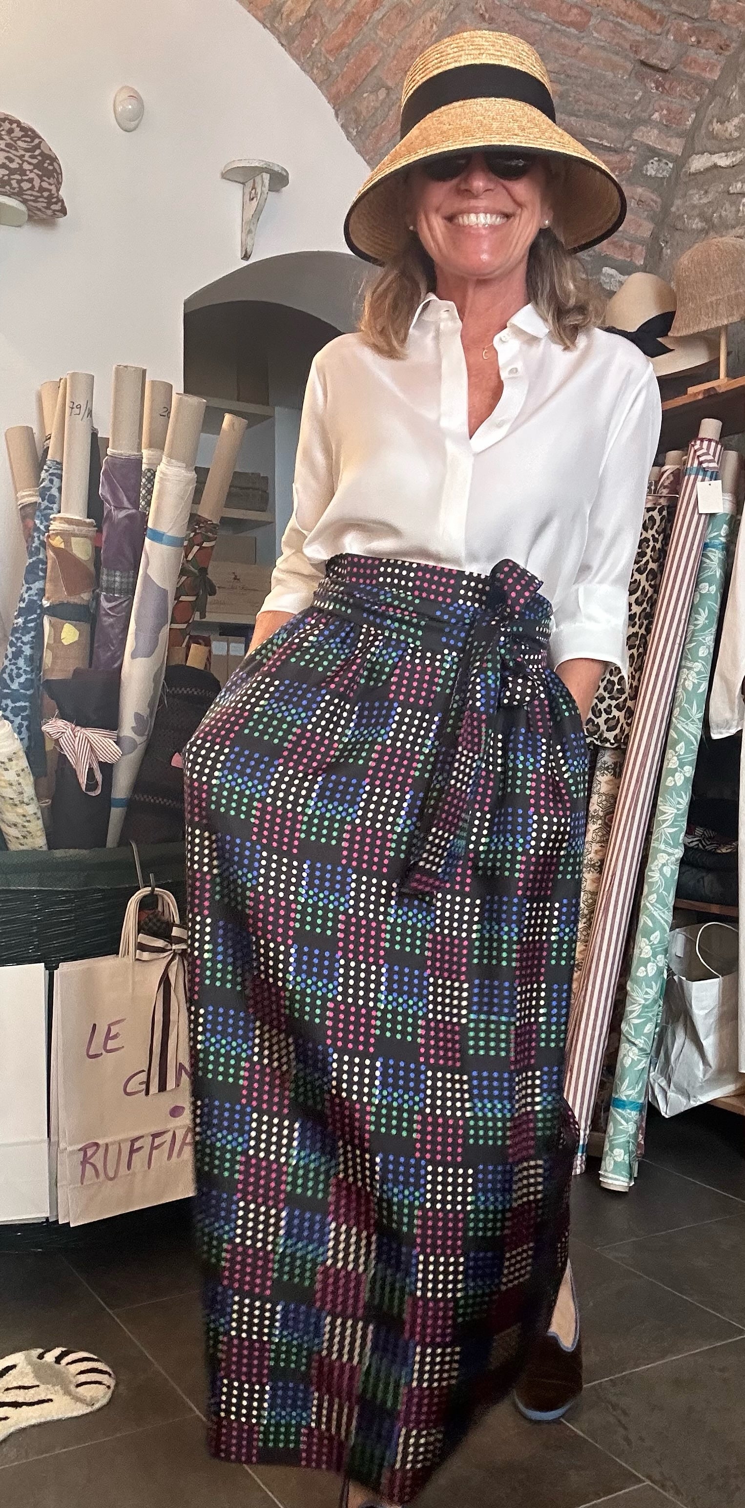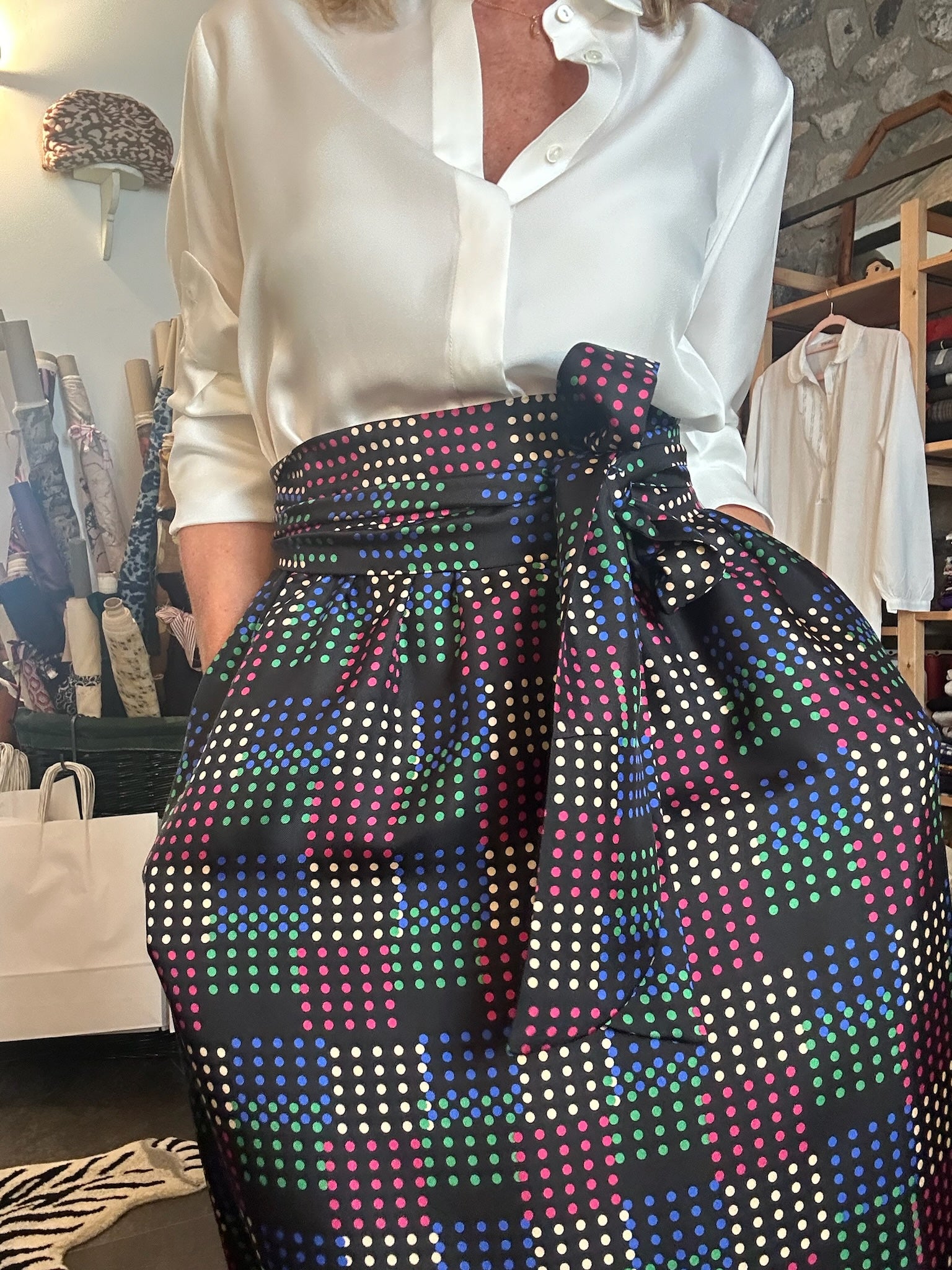 Gonna Odette in twill di seta, tubolare, fondo nero/pois colorati, con elastico, tasche e fusciacca da annodare in vita.