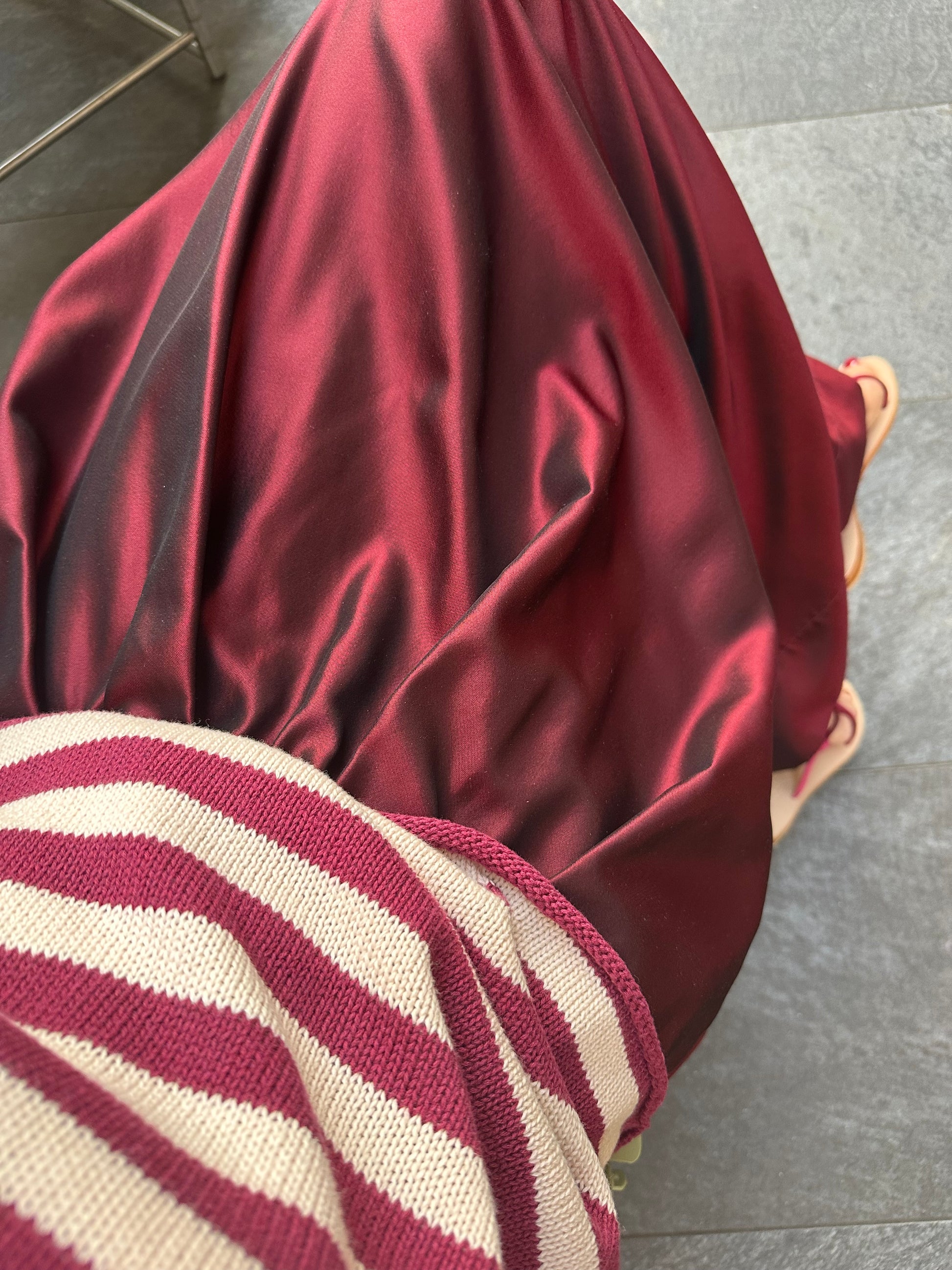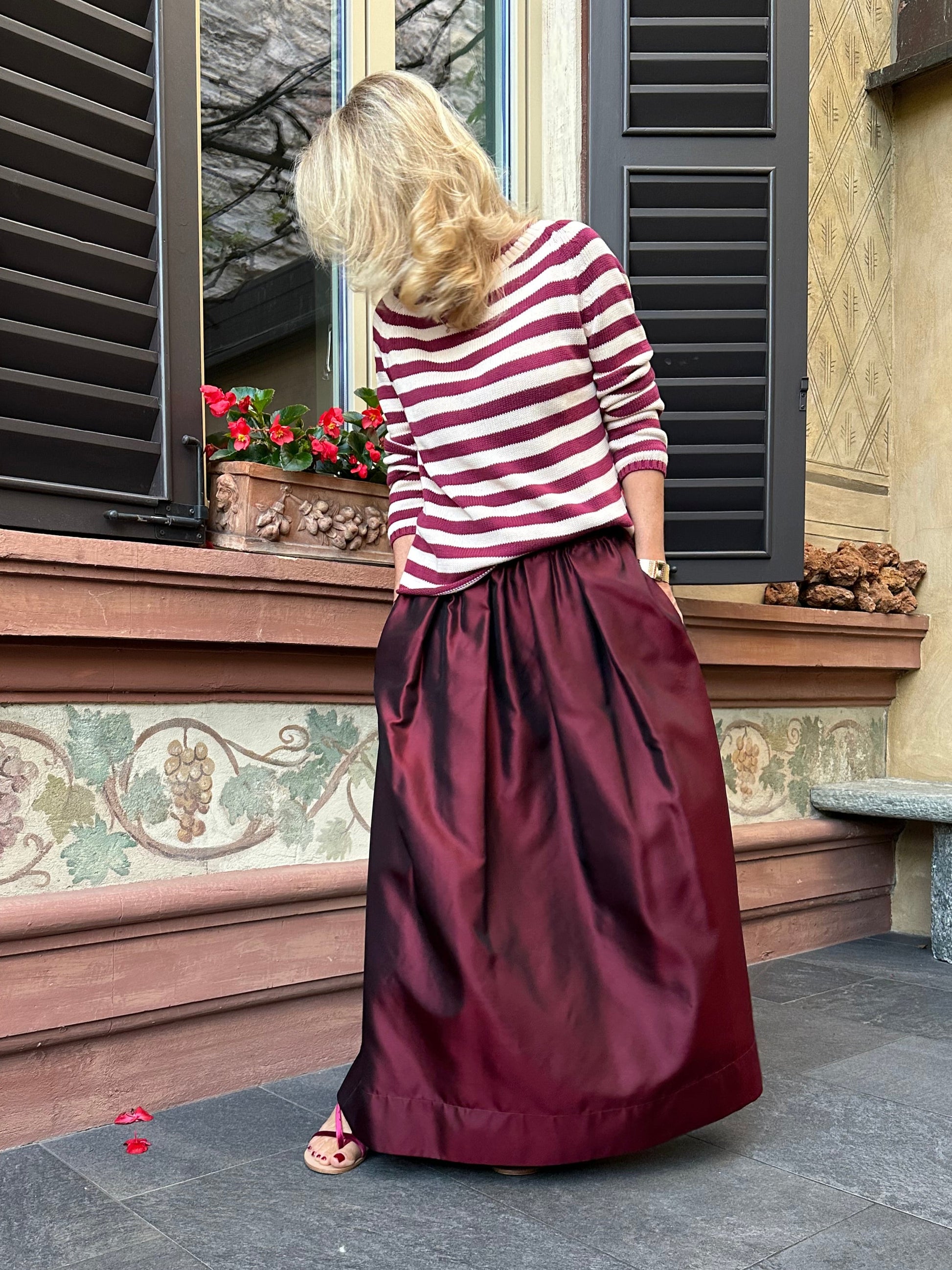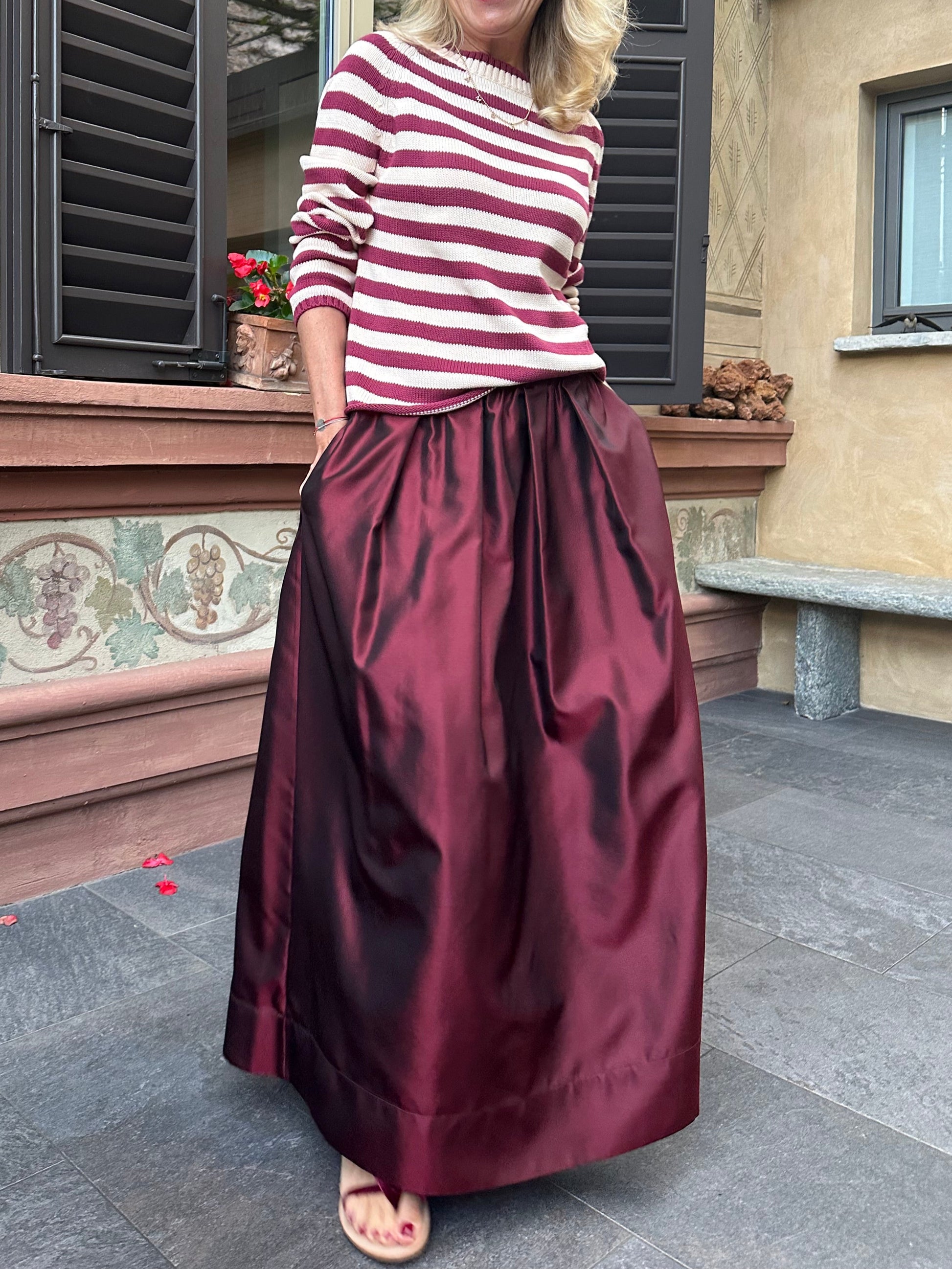 Gonna Sissy in taffetà di seta, colore burgundy, con sfondi piega davanti e dietro, elastico, tasche e fusciacca da annodare in vita.