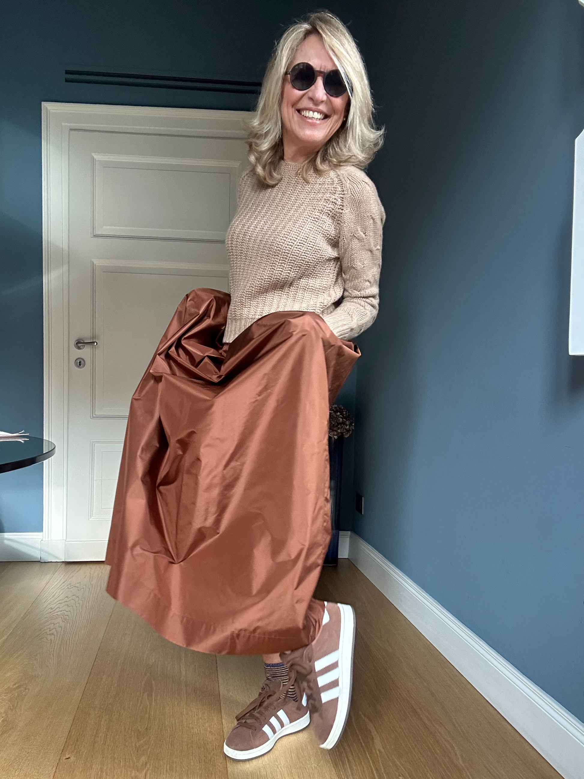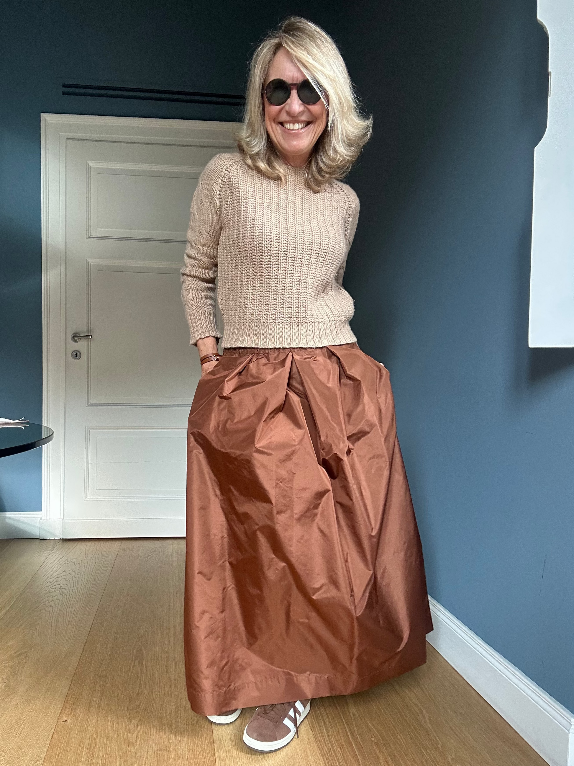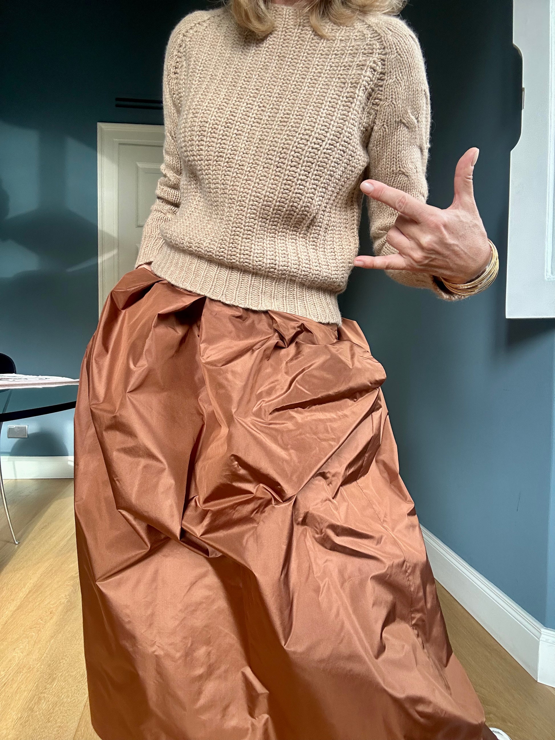 Gonna Sissy in taffetà di seta, colore caramello, con sfondi piega davanti e dietro, elastico, tasche e fusciacca da annodare in vita.
