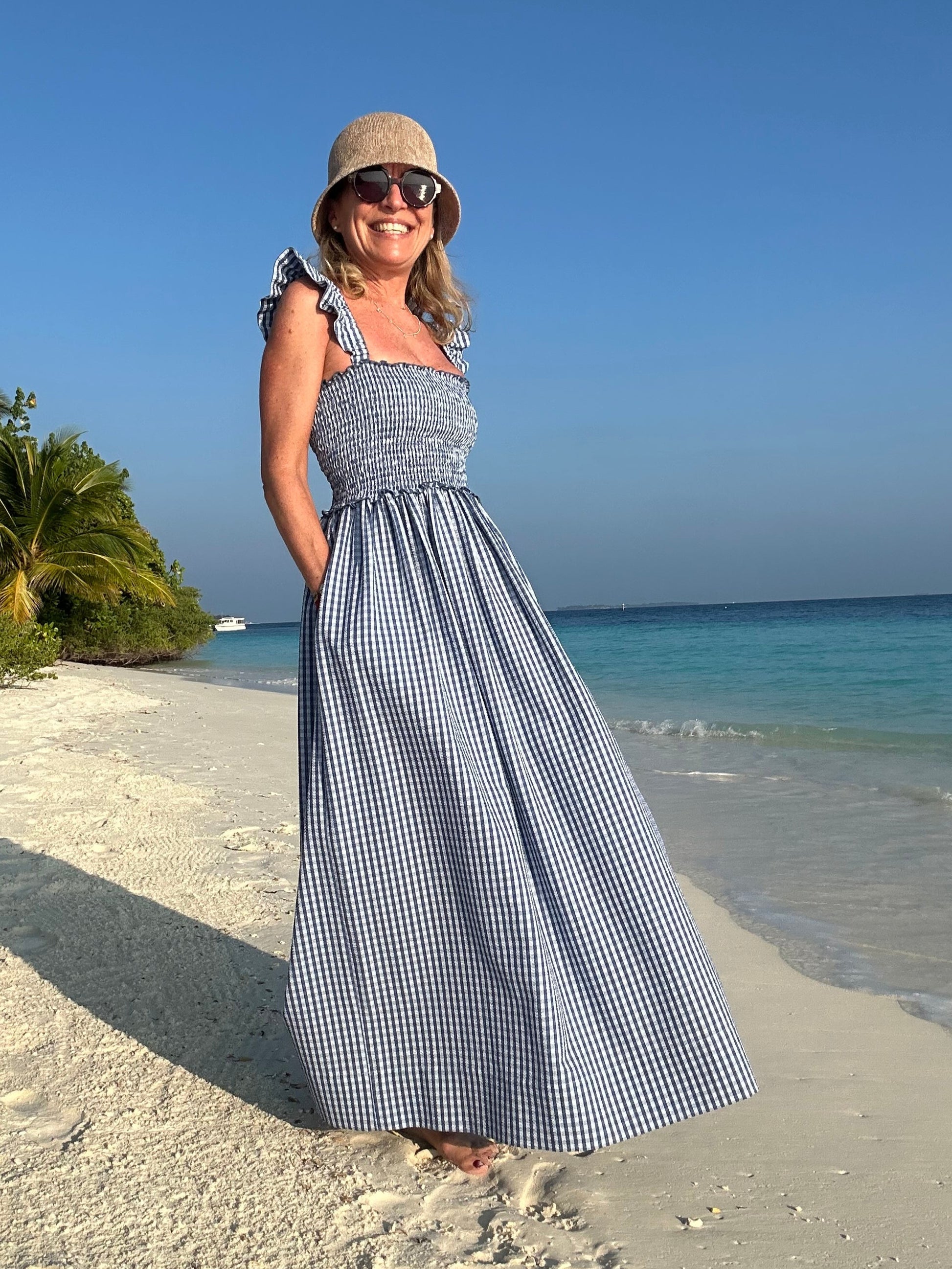 Il prendisole è realizzato con una pettorina a nido d’ape, spalline con volants e tasche.